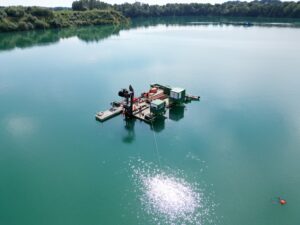 Dat klopt. Zonneparken worden regelmatig op water aangelegd bij bijvoorbeeld zandwinningsgebieden. Vaak worden deze vastgelegd met kabels die aan de zijkant van het water worden verankerd. Hierdoor is het onderhoud in de praktijk lastig, immers de kabels zitten dan in de weg. Wij hebben een techniek waarmee we de kabels in de bodem verankeren, recht naar beneden. Dit vergemakkelijkt het onderhoud aanzienlijk en dat is natuurlijk fantastisch.