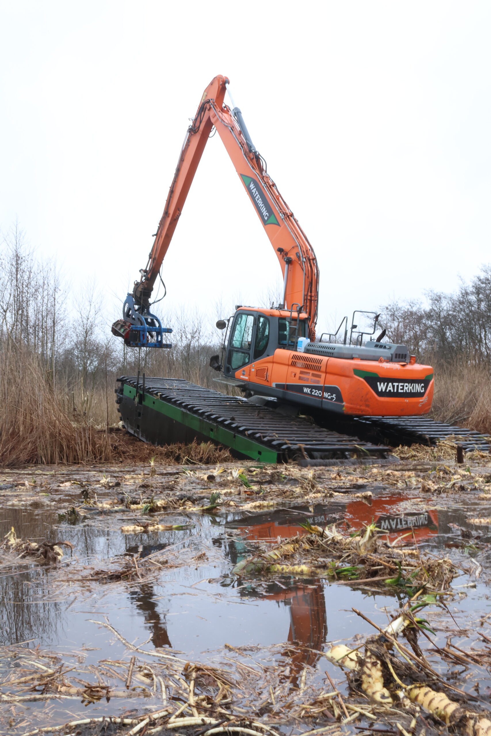 Bij veel natuurherstelopdrachten heb je te maken met projecten in drassige gebieden met bijvoorbeeld veel moerasgrond. Hier kan je met traditioneel materiaal alleen overheen rijden door gebruik te maken van rijplaten. En dan heb je het al snel over grote afstanden. Jakob had hiervoor hele andere ideeën en gelukkig mochten we bij een project in de Nieuwkoopse Plassen eindelijk een test doen met een amfibische graafmachine.